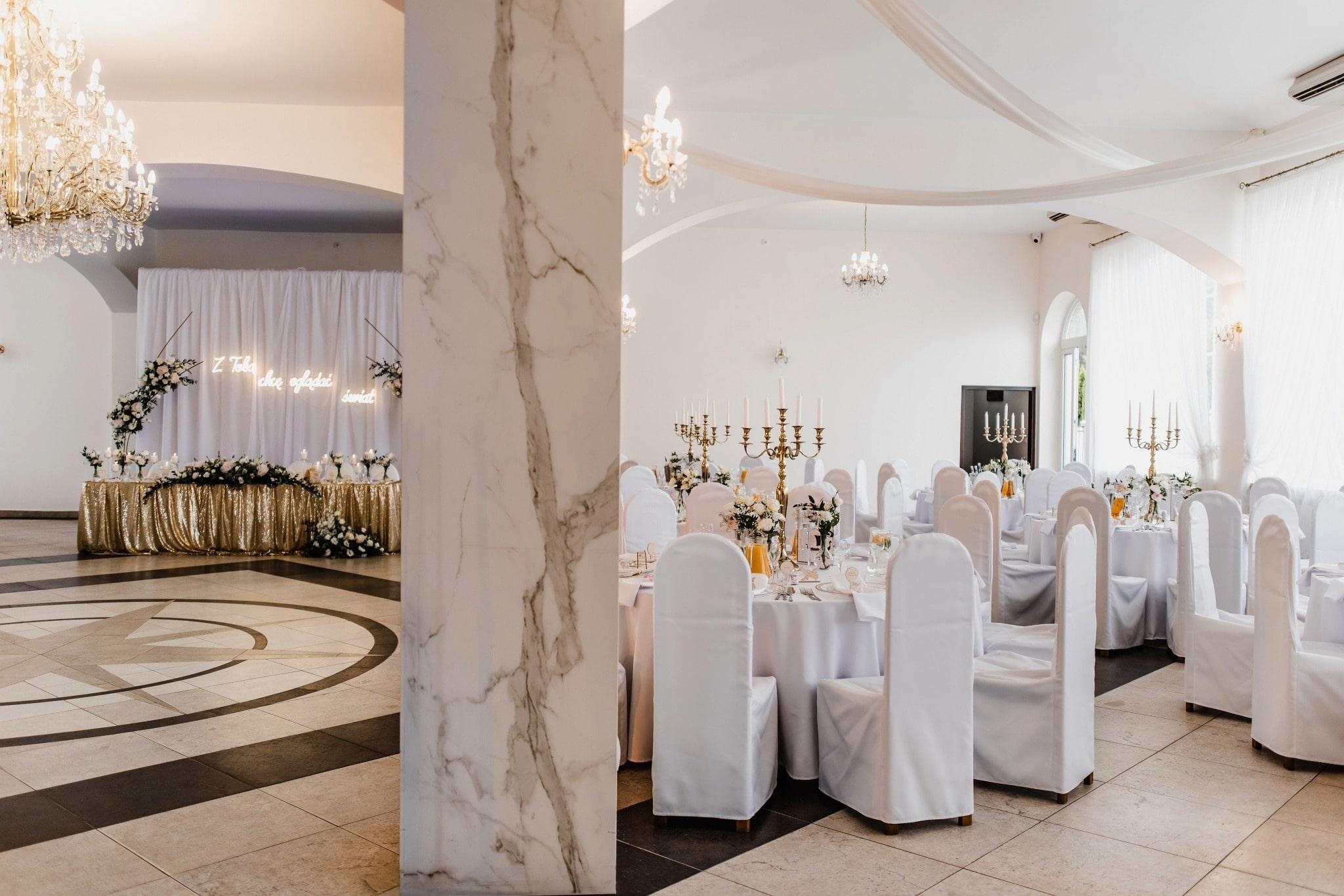 - Sala Balowa: umożliwia organizację przyjęć do 250 osób przy stołach prostokątnych lub do 180 osób przy stołach okrągłych. Sala wyposażona jest w przestrzeń taneczną o powierzchni ok. 80 m² oraz podest dla wykonawców.