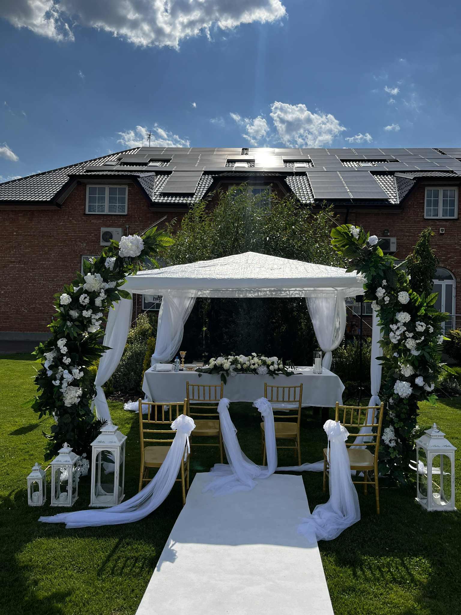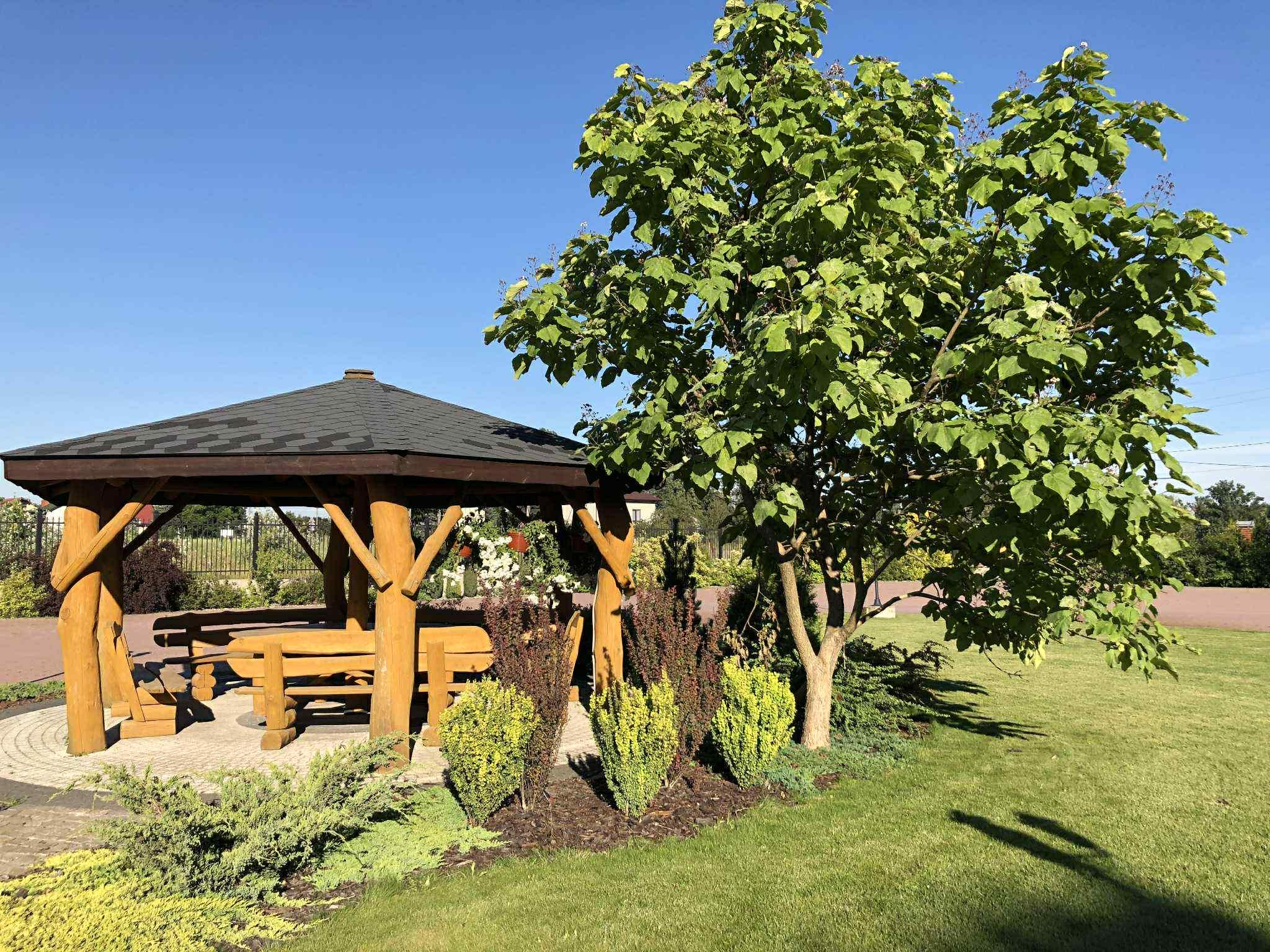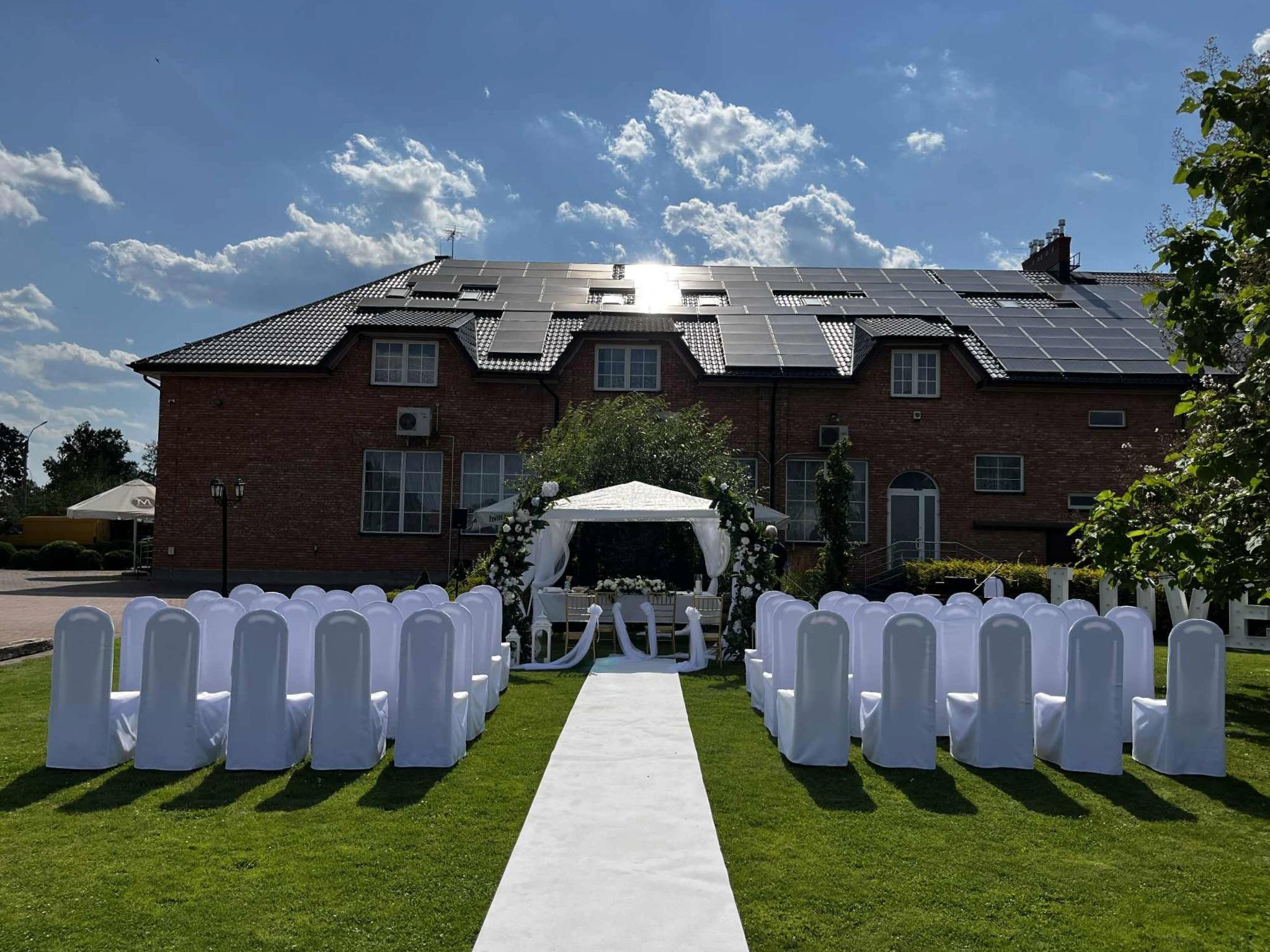 Ślub w plenerze: Możliwość przygotowania zadaszonej przestrzeni z miejscami siedzącymi do ceremonii cywilnej lub kościelnej na terenie ogrodu.